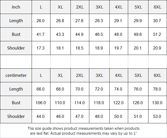 | inch | L | XL | 2XL | 3XL | 4XL | 5XL | 6XL |
